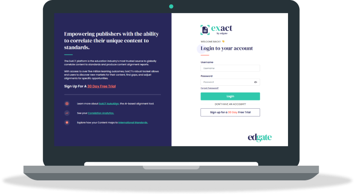 Managing academic standards and content alignment doesn’t have to be complex. ExACT Standards Alignment Platform is the education industry’s premier platform for aligning and managing standards, designed to help publishers, educators, and organizations connect curriculum to academic frameworks with confidence. Powered by EdGate’s patented taxonomy, ExACT enables rapid, scalable alignment across K–12 and international frameworks, including Common Core, NGSS, and CTE.